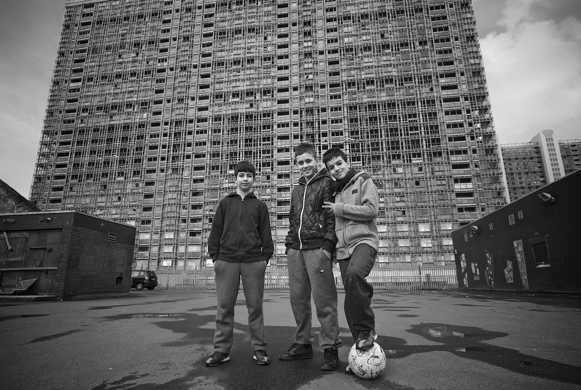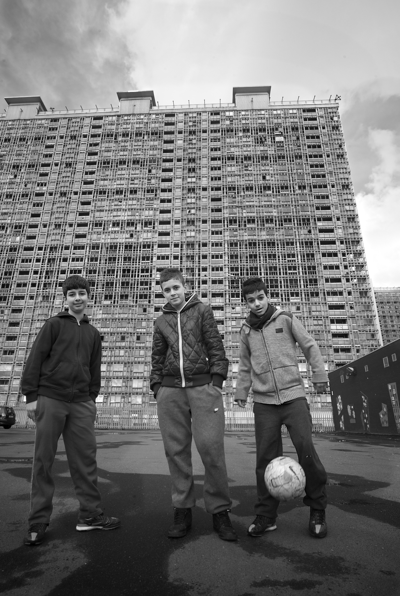 I recently took some photos of the Red Road flats. I took two cameras with me and shot them from many different angles. When we approached the first three building flat, we came across kids playing just in front of it upon spare ground. We learned that two of them were brothers and had came to Glasgow from Baghdad just after the American bombing of the city. We then learned that the third boy had came only recently from Libya with his family. Upon me asking what they all thought of Glasgow and their new homes, one of them replied to me saying he thought it was a beautiful place. I couldn’t help but feel sad. There he was on a piece of spare ground in the middle of these decaying monstrous structures and he was commenting on the beauty of the place. These are just a handful of the photos I took that day.