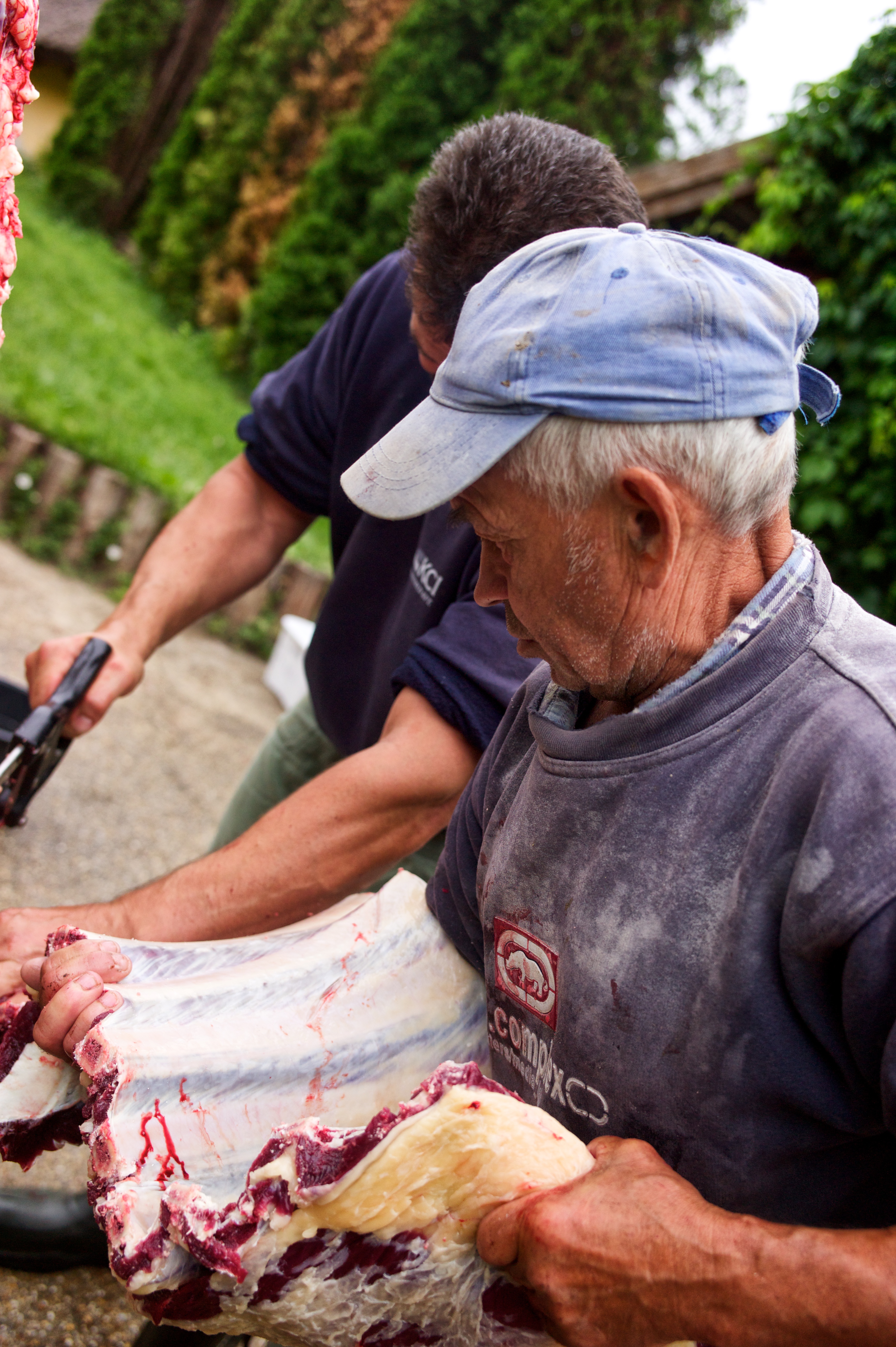 You can hopefully see in some of these photos that the butcher was very delicate and precise in his cuts and carvings, and almost like a sculptor at certain points. All the while a small farm dog watched the proceedings and every time another piece of meat was cut away and dropped to the ground, this was punctuated by him licking his whiskers and looking excited.